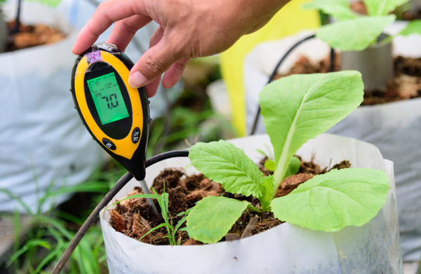 测量水培系统或者土壤中营养液的pH值有多种方法。土壤pH值可以用pH计或者pH指示剂直接在土壤中或者通过检测土壤样本来测定。测定土壤pH值最准确的方法是用pH值测量土壤样本。为此,需要从不同区域各取一份土壤样本,将这些样本充分混合。取一杯混合土壤样本,加入1.5杯软化水,搅拌均匀后静置约1小时。